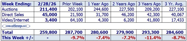 Data released by USDA on 3/2/26 for the week ending 2/28/26...