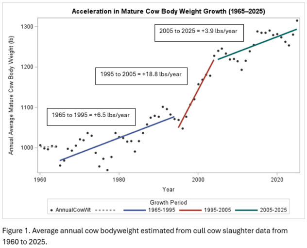 Over the past 60 years, mature cow body weight has increased at an annual average of 7.7 pounds per year, but it has not increased at a constant rate.