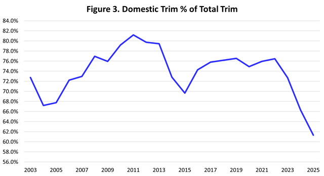The challenges of meeting ground beef demand are substantial. Ground beef utilizes fatty trimmings from fed cattle and lean trimmings from cull cows and other sources. Total cow slaughter decreased 28.7 percent from 2022 through 2025, leading to a 24.8 percent decrease in nonfed beef production. This is the primary source of lean processing beef used in ground beef mixtures. There are a multitude of ways to prepare ground beef mixtures but a ratio of seven pounds of 90 percent lean to one pound of 50 percent lean is representative of a common 85 percent lean ground beef mixture. This means that seven pounds of cull cow-type beef is required for each pound of trimmings from fed steers and heifers. Fed carcasses produce 150-250 pounds of trim, which means that the lean trim from three to four cull cows is needed to utilize all of the fatty trimmings from each fed carcass. Not enough cow beef is available and lean supplies are routinely supplemented by imported lean. Over the past 20 years, an average of 25 percent of total trim used for ground beef has been from imported beef. In 2025, imported trim accounted for an estimated 38.7 percent of total ground beef trim, leading to the domestic lean share of trim at the lowest level in more than 20 years, currently 61.3 percent (Figure 3). Increased imported trim in the current market is important to support the value of fatty trimmings from fed cattle.