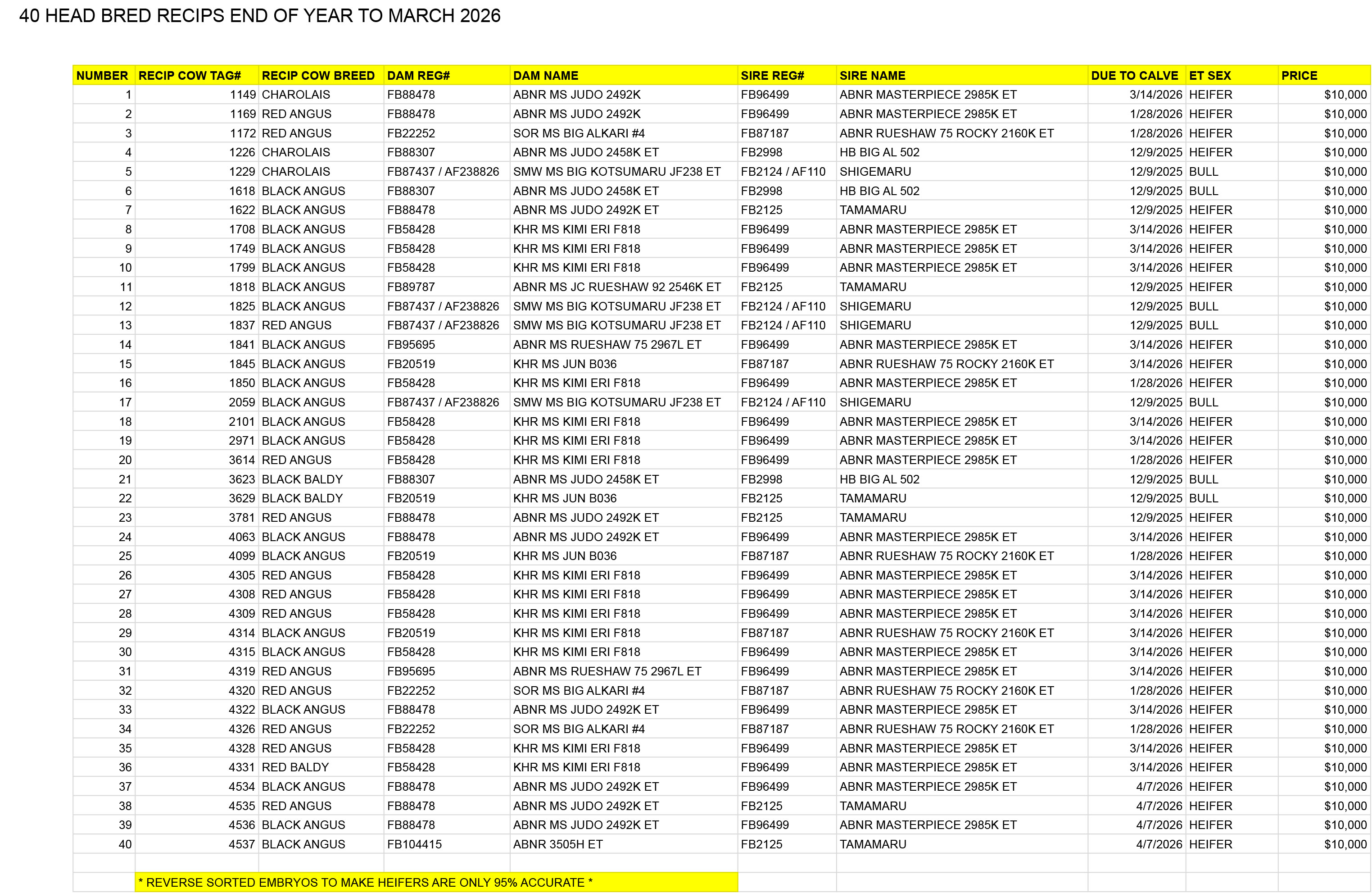40 Head of Bred Recip cows that have been ET (embryo transfer) with a registered Fullblood Red Wagyu embryo...