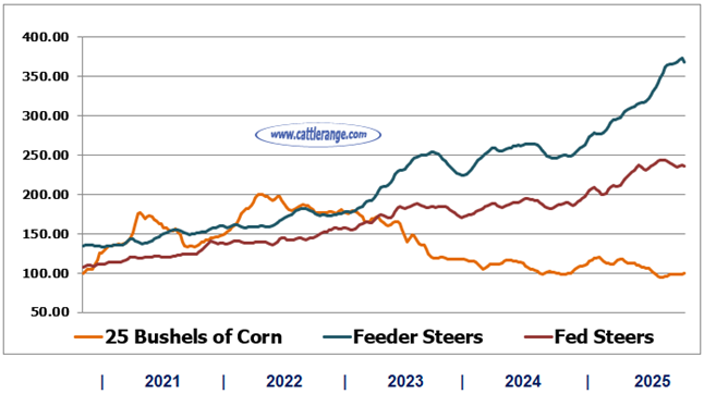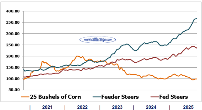 Feeder & Fed Steer Prices vs. 25 Bushels of Corn