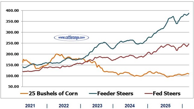 Feeder & Fed Steer Prices vs. 25 Bushels of Corn