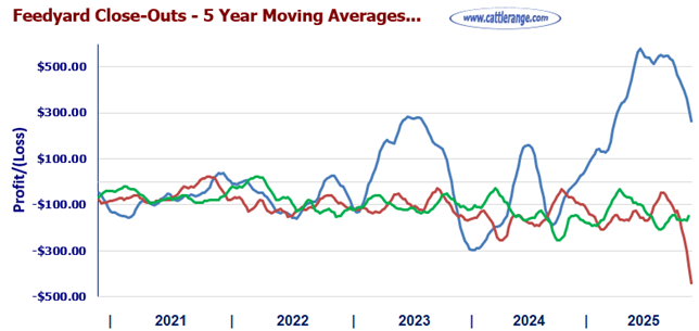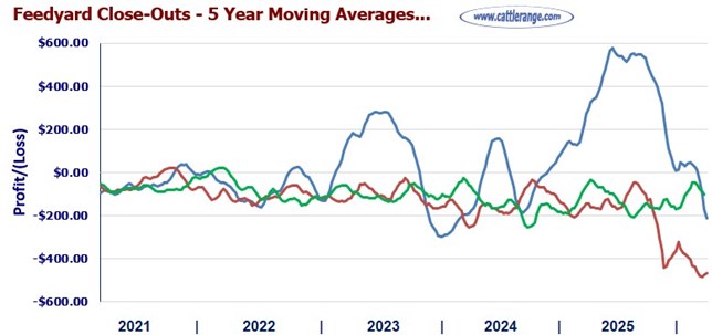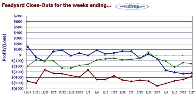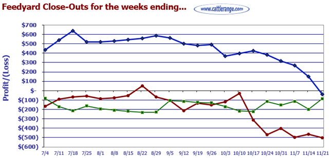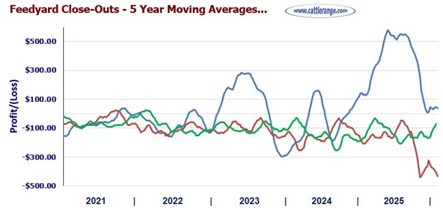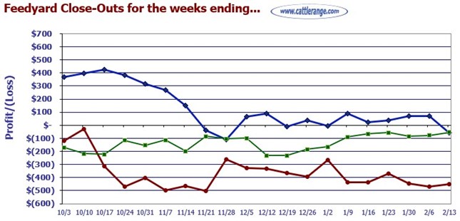 Closeout projections are for cattle placed on feed by a cattle owner at a commercial feedyard and not for cattle owned by a vertically integrated company such as a beef processing company or a feedyard feeding cattle at cost. Cattle cost, cost of gain, and selling price will vary on a regional basis. Cost includes $15 per head for freight to feedyard.