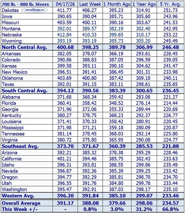 Feeder Steer Prices for the week ending 4/17/26...